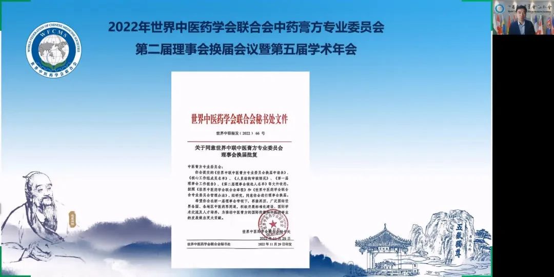世界中聯(lián)主席馬建中通過視頻方式致辭,向參加中醫(yī)膏方專業(yè)委員會第二屆理事會換屆會議的線上嘉賓表示歡迎。他講到,近年來,黨和國家高度重視中醫(yī)藥的發(fā)展,出臺了一系列支持政策,黨的二十大報告再次強調(diào)“促進中醫(yī)藥創(chuàng)新傳承發(fā)展”,這些都為中醫(yī)藥事業(yè)發(fā)展提供了堅強保障。世界中聯(lián)是全球最大的中醫(yī)藥國際學術(shù)組織,在中醫(yī)藥深入?yún)⑴c全球治理中持續(xù)發(fā)揮著重要作用。在中醫(yī)藥深入?yún)⑴c全球治理中持續(xù)發(fā)揮著重要作用。膏方是中醫(yī)養(yǎng)生文化的精髓,在進補方面有深厚的臨床經(jīng)驗,膏方即可治療慢性疾病又可滋補大病過后的虛弱病體,是兼顧治療和補虛雙重作用的良劑。中醫(yī)膏方專業(yè)委員會在董瑞會長帶領下,在組織學術(shù)會議和開展國際交流、抗擊疫情、科研創(chuàng)新、醫(yī)療幫扶等方面做了大量工作,促進了中醫(yī)膏方走向世界,關注民間中醫(yī)藥瑰寶的挖掘整理,通過政協(xié)提案促進民間膏方傳承及其制作工藝的搶救,為保護民間膏方獻技出力,開展科研課題與臨床實踐提高藥方、膏方的臨床療效,踐行“療效是中醫(yī)藥生命線”的真理,發(fā)出倡議鼓勵理事們積極投入抗疫,第一屆理事會工作取得了突出成績,榮獲了世界中聯(lián)頒發(fā)的“抗擊疫情榮譽集體”稱號和2020-2021年度先進分支機構(gòu)三等獎。希望新一屆理事會在董瑞會長領導下,能夠充分發(fā)揮世界中聯(lián)平臺優(yōu)勢,繼續(xù)辦好“一帶一路”雁棲湖中醫(yī)膏方國際高峰論壇,加快膏方相關標準起草,促進膏方產(chǎn)品和市場開發(fā),加強國際交流交往,助力中醫(yī)藥走向世界。