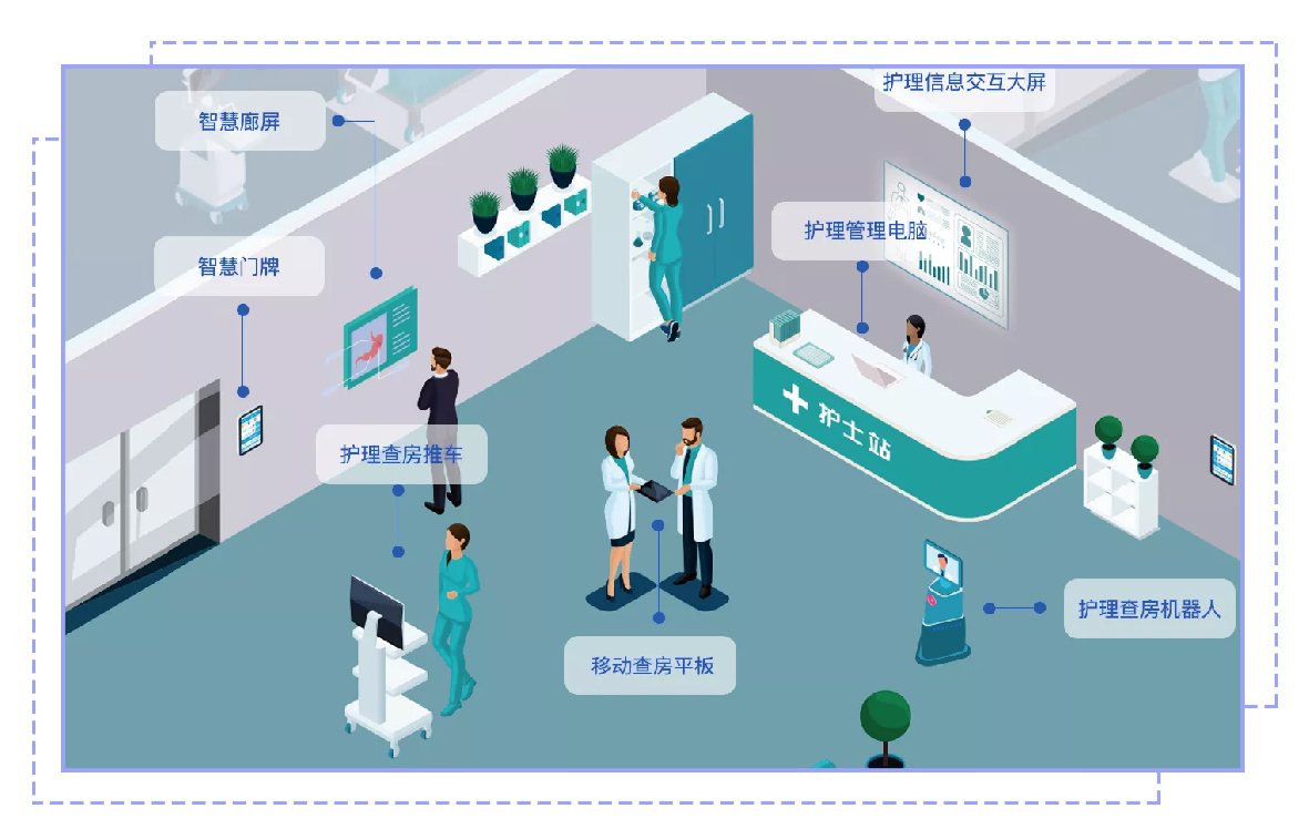 目前,根據(jù)湖南省腫瘤醫(yī)院智慧病房建設(shè)項目需求及場地條件,基于院內(nèi)智能應(yīng)用場景將布局結(jié)構(gòu)劃分為:護士站、醫(yī)生辦公室、病房走廊、病房內(nèi)部,每個區(qū)域配備智能信息化設(shè)備。