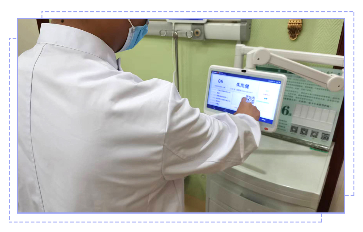 患者床頭屏是一個電子化的床頭卡,它結(jié)合了傳統(tǒng)的床頭呼叫器,患者需要幫助時可一鍵呼叫,并且它還可以實時更新患者數(shù)據(jù)顯示,有了它護士每日可快速完成三查七對的護理工作。